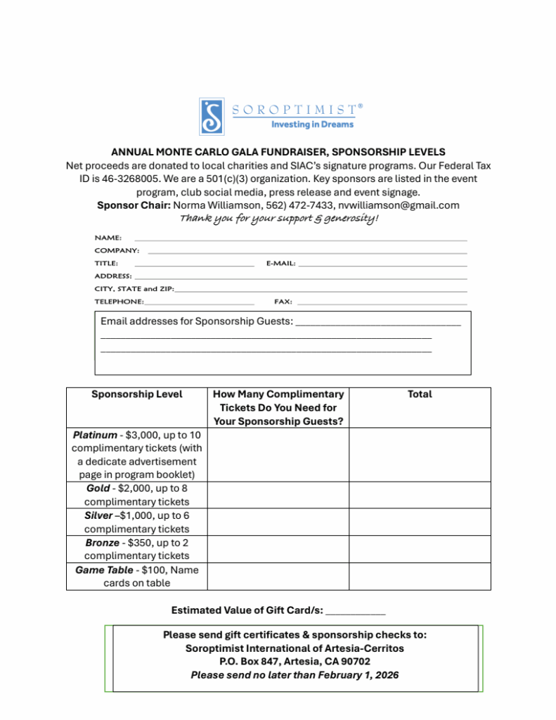 Download Sponsorship Form Contact: P.O. Box 847 Artesia, CA 90702-0847 siartesia.cerritos@soroptimist.net